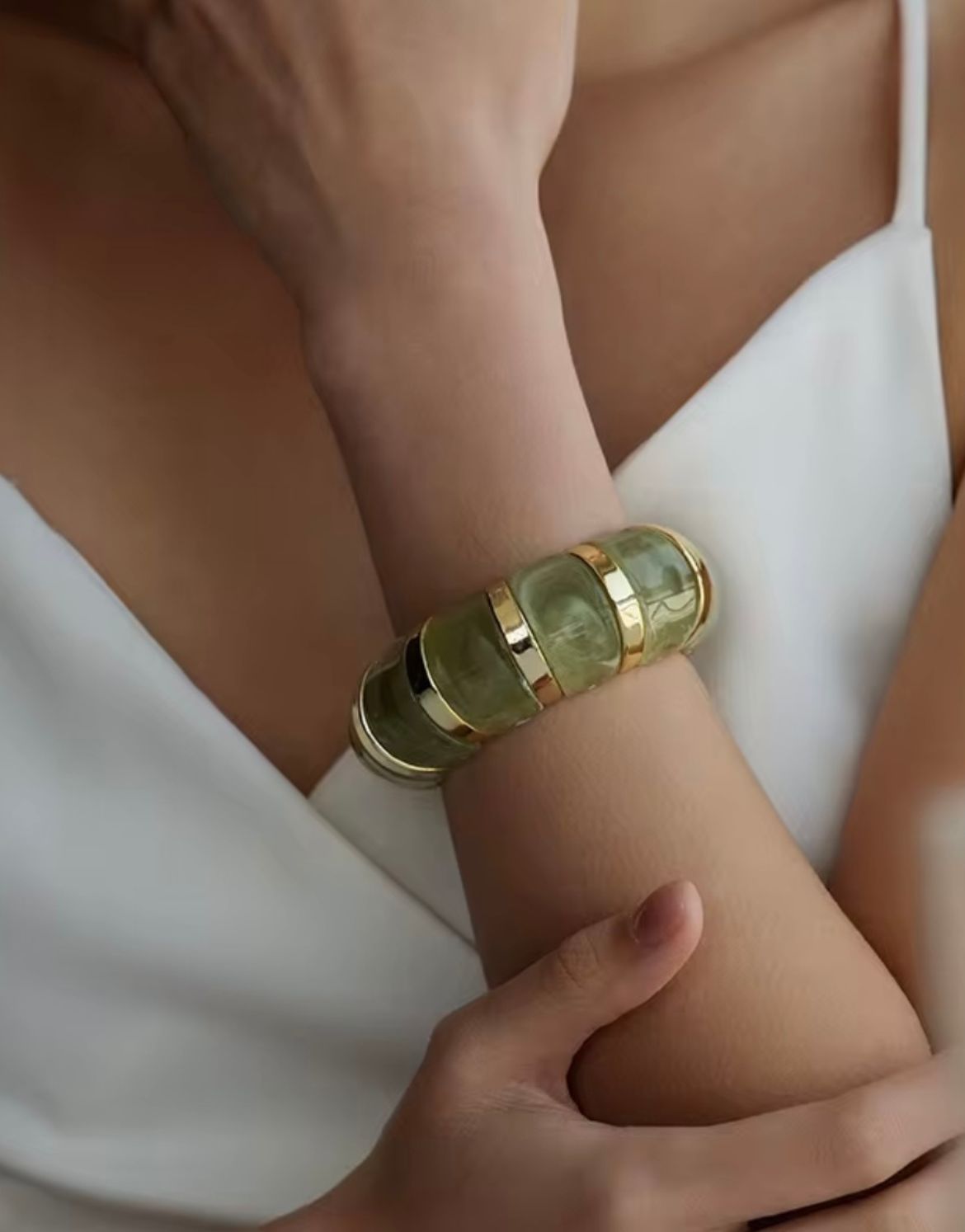 Stainless steel base with resin and 18k gold plating. Smooth resin with polished gold accents. Adjustable elastic cuff, anti-tarnish, and long-lasting shine