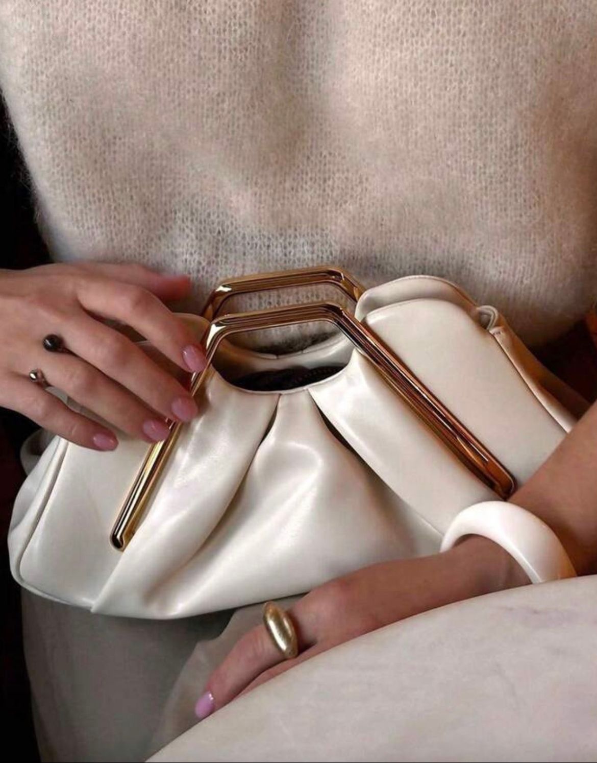 Crafted in rich PU leather, the bag has a smooth, luxurious finish that elevates any look. The sculpted gold metal handles add an architectural edge, balancing softness with structure. Elegant and understated, it’s well suited for dinners, evenings, and occasions that call for refined style.